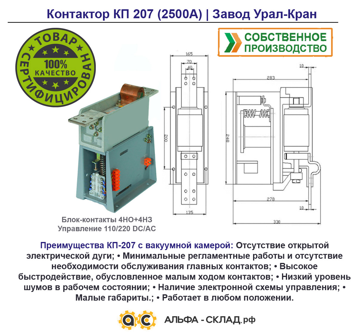 Цена на контактор КП-207 зависит от требуемого количества, сроков поставки, цены на комплектующие детали на момент запроса и рассчитывается индивидуально.