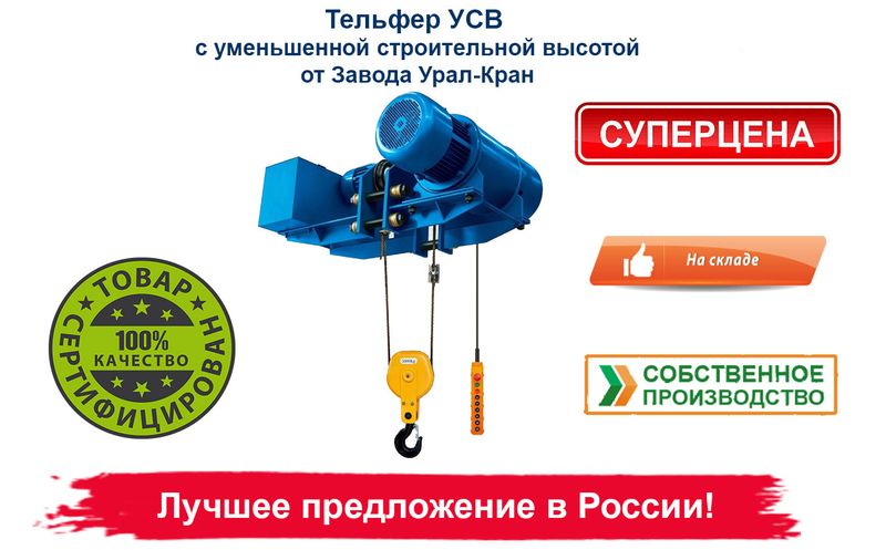 Тельфер (электрическая таль) УСВ 1т, 2т, 3.2т и 5т с уменьшенной строительной высотой от завода Урал-Кран по низким ценам! 100% высокое качество! Официальная гарантия! Наличие любых запчастей! Наличие на складе! Бесплатная доставка до ТК!